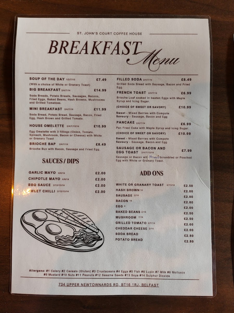Welcome to St Johns Court Coffee House, a hidden gem located in Dundonald, Belfast. This delightful café invites you to experience a menu that boasts something for everyone. For those seeking a hearty start to the day, the St. Johns Big Breakfast at £11.49 is a must-try, offering a perfect combination of scrambled eggs, bacon, and toast. If you're in the mood for something lighter, consider the deliciously crafted toasted bagels or a filled soda, both priced under £4.
